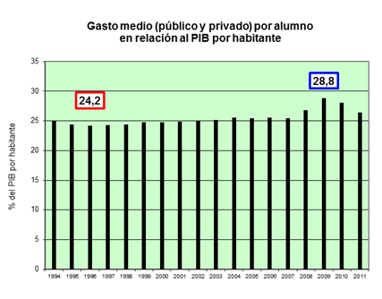 Dato en rojo: menor gasto medio (público y privado) por alumno. |