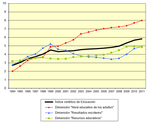 | Índice sintético de Educación y sus dimensiones | |||||||