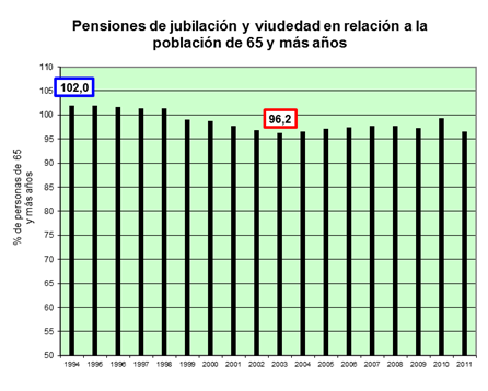 Incluye pensiones contributivas de jubilación y viudedad, pensiones no contributivas de jubilación y pensiones asistenciales de vejez. A partir del mes de diciembre de 1997 las pensiones contributivas de incapacidad permanente de personas mayores de 64 años (unas 900.000) pasan al epígrafe de pensiones contributivas de jubilación, por lo que hemos procedido a un ajuste de los años 1994-97 sobre la base del año 1998.  Algunos años de la Serie de base suman más de 100 porque, en el caso de las pensiones contributivas, una parte de los pensionistas tiene menos de 65 años y, además, una misma persona puede acumular las pensiones de jubilación y viudedad.
