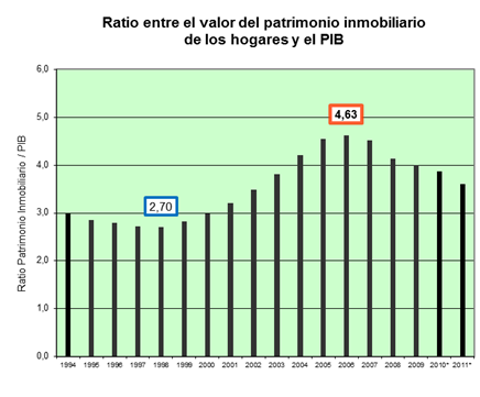 Ratio entre el valor patrimonial de las acciones (cotizadas y no cotizadas), otras participaciones empresariales y fondos de inversión del total de la economía española (Cuentas financieras del Banco de España) y el PIB (Contabilidad Nacional de España).
