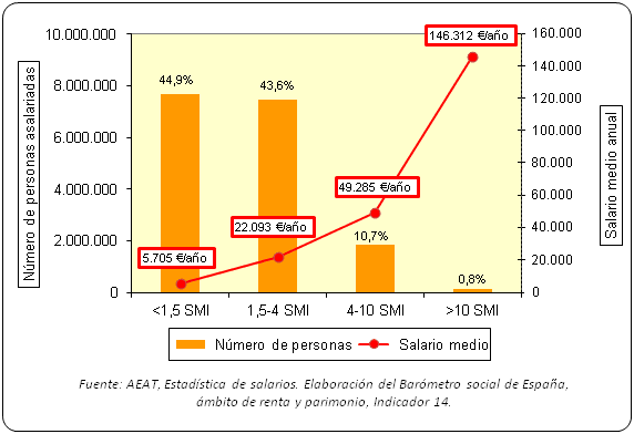 El tramo superior (más de dos mil quinientos euros/mes) incluye al 10% de personas asalariadas. A su vez, en la cúspide de este segmento destaca una minoría del 1% (exactamente el 0,8%) con salarios por encima de 10 veces el SMI. En este grupo se sitúan los 900 consejeros y miembros de la alta dirección de las empresas incluidas en el Ibex 35 cuyos ingresos medios en 2013 fueron de 54.000 euros mensuales. Se trata de un grupo social formalmente asalariado pero cuyas funciones son las de dirección de las empresas representando directamente los intereses de sus propietarios.