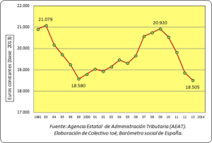 La evolución del salario medio en las dos últimas décadas no ha sido lineal sino que ha oscilado recorriendo tres etapas: descenso de 12 puntos porcentuales de poder adquisitivo entre 1993 y 1999, a caballo entre la crisis de 1992-93 y el inicio del largo ciclo expansivo que le siguió; subida de 13 puntos entre 1999 y 2009, coincidiendo con la última etapa del ciclo expansivo y los primeros años de la crisis; y nueva bajada de 11 puntos entre 2009 y 2013. Los perceptores de salarios han pasado, según la Agencia Tributaria, de 19,3 millones de personas en 2007 a 16,7 millones en 2013, es decir, se han reducido en un 13,5% en la reciente etapa de crisis; sin embargo, la masa salarial (la suma de todos los salarios) se ha reducido mucho más (-19,6%), dando lugar a una caída importante del salario medio.
