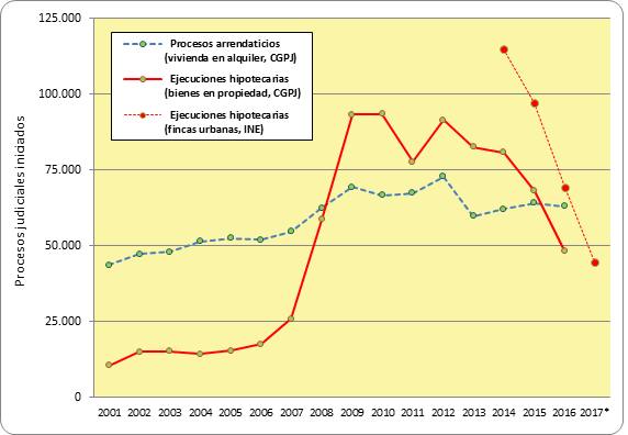 [2] La estadística del CGPJ distingue entre procesos “iniciados” y “resueltos” a lo largo de cada año. La suma de “ejecuciones hipotecarias” resueltas entre 2001 y 2016 es de 680.502 (84,1% de las iniciadas) y la de “procesos arrendaticios” resueltos 904.111 (96,4% de los iniciados).