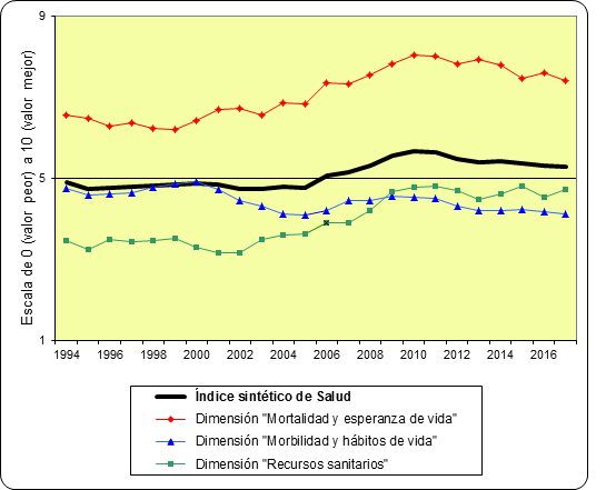 El Gráfico adjunto recoge la evolución en el último cuarto de siglo del índice sintético de Salud, que se elabora a partir de 31 indicadores[1] agrupados en tres dimensiones: mortalidad, morbilidad y recursos sanitarios.[2] Se puede observar que la evolución general (línea gruesa de color negro) supera el nivel medio de la escala en el año 2006, para mejorar de forma significativa hasta 2010 y empeorar lentamente a partir de esa fecha.