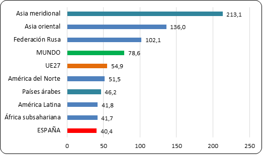 Es frecuente destacar que España es una de las grandes economías de la UE27, la cuarta actualmente por su volumen de renta, por detrás de Alemania, Francia e Italia. Sin embargo, apenas se recuerda que ocupamos el puesto 15 en renta por persona, bastante por debajo de la media comunitaria, y el 23 en ritmo de crecimiento. El PIB total de nuestro país creció un 69% entre 1994 y 2022 y el PIB por persona un 40%, debido a que la población aumentó en 7,2 millones entre dichos años. Con datos del Banco Mundial sobre la evolución de la renta en «paridad de poder adquisitivo», que permite hacer comparables los resultados, nuestra tasa de crecimiento por persona desde 1994 está por debajo de la media mundial (79%) y de las principales regiones del mundo (Gráfico 1), y a años luz de China, que ha multiplicado por siete su economía (735%). Al interior de Europa, el país más expansivo ha sido Irlanda (281%), paraíso fiscal que atrae capitales del exterior por sus bajos impuestos, y los que menos han crecido Italia (16%), Grecia (28%) y Francia (33%). Una cura de humildad para los países ribereños del Mediterráneo, incluida España, cada vez con menos peso en el concierto internacional.