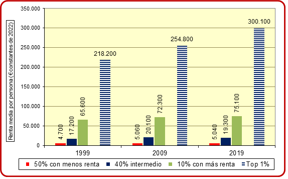 Las dos citadas encuestas (ECV y EFF) tienden a subestimar los ingresos más altos y no captan la renta total de los países, por lo que un instituto privado, el Word Inequality Lab, coordinado por Piketty, Saez y Zucman, (6) ha desarrollado un método más completo para medir la desigualdad en la distribución anual de la renta que combina datos fiscales, encuestas y cuentas nacionales, y es 100% consistente con la contabilidad nacional. Para el caso de España se obtienen los resultados que se resumen en el Gráfico 3. La mitad de España con menos ingresos percibió en 1999 el 15% de la renta producida en ese año, casi seis veces menos que la otra mitad de la población, que percibió el restante 85%. Veinte años después, la renta por persona mejoró un 6% para el 50% con menos ingresos, un 12% para el sector intermedio (percentiles 51-90) y un 15% para el 10% con más ingresos. El mayor incremento lo protagonizó, dentro de este último grupo, el top 1% que aumentó sus ingresos un 38%. En definitiva, la desigualdad en el reparto de la renta, que ya era grande al final del siglo pasado, se ha ampliado en las dos primeras décadas del siglo XXI, sobre todo en relación al último percentil de renta (medio millón de personas) que, por sí solo, se apropia de más renta que los 24 millones de los 50 primeros percentiles.