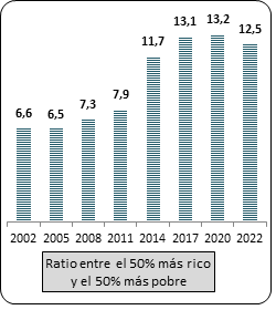 Según la citada EFF del Banco de España, la ratio o división entre el patrimonio medio de la mitad más rica del país y la mitad más pobre ha pasado de 6,6 en 2002 (405.349€/61.707€) a 12,5 en 2022 (571.890€/45.650€), lo que supone que la desigualdad de riqueza entre ambos grupos se ha doblado en sólo dos décadas. La mitad más rica ha aumentado su patrimonio neto en un 41% y la más pobre lo ha recudido en un 26%. Si la comparación la establecemos entre el patrimonio medio del 1% más rico y del 50% más pobre, la ratio casi se ha triplicado, de 52 a 131 debido a que el 1% más rico ha inflado su riqueza en un 86% (de 3,2 a 6 M€). La novedad es que estas ratios de desigualdad se han reducido de forma significativa entre 2020 y 2022, bajando de 13,2 a 12,5 en el primer caso y de 163 a 131 en el segundo (Gráfico 5).