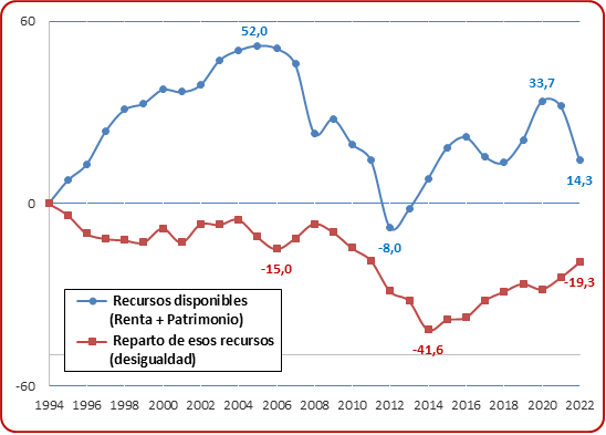 El índice sintético de reparto de los recursos (desigualdad) presenta una evolución negativa, también con tres fases. Hasta 2008 tuvo lugar una pequeña bajada del índice, de en torno al 10%, precisamente cuando el índice de recursos disponibles había subido por encima del 50%, lo que significa que el crecimiento general de la economía no se tradujo en una redistribución más equitativa de los bienes producidos. No obstante, en esa larga etapa de 15 años hubo algunas mejoras: el coeficiente de Gini de desigualdad de la renta mejoro 2-3 puntos y también se redujo la polarización territorial (la renta media de las 5 comunidades más ricas superaba en un 75% a la renta media de las 5 más pobres en 1998 y se redujo al 60% en 2008). En cambio, la evolución fue negativa en los indicadores relacionados con la distribución de la riqueza, el endeudamiento de los hogares más pobres y la desigualdad salarial. Asimismo, el valor de mercado de las acciones empresariales se alejó mucho del crecimiento económico general, pasando de 0,7 veces el PIB en 1994 a 2,5 veces en 2007, y todavía más el patrimonio inmobiliario de los propietarios de viviendas que pasó de 2,9 a 4,4 veces el PIB. Una revalorización desmesurada del capital financiero e inmobiliario, fruto de movimientos especulativos, que iba a provocar la profunda crisis económica de los años siguientes.