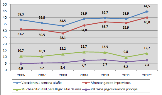 Por otra parte, esta mejoría parcial parece ser un fenómeno episódico. ¿En qué se basa esta afirmación?: en otros resultados de la propia ECV. Conviene apuntar que las tasas de pobreza se basan en la distribución de la renta durante al año anterior a la realización de la encuesta (así, los resultados ofrecidos en 2012 corresponden en realidad a 2011). Pero el resto de la información recogida sí se refiere al año en curso; por ejemplo la que se refiere a las dificultades económicas que experimentan los hogares. Estos datos muestran (ver Gráfico) que dichos indicadores mejoraron en 2011 (año de referencia del último dato sobre pobreza) pero en 2012 volvieron a empeorar, y algunos de ellos alcanzaron máximos históricos.