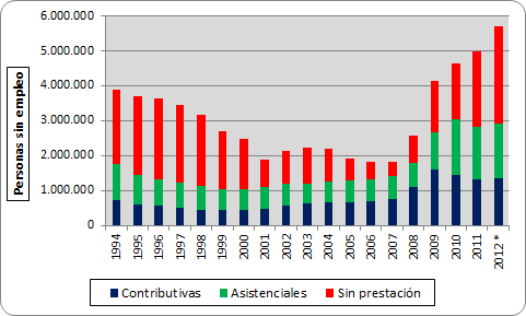 [1] En cifras absolutas es el valor histórico más amplio, aunque porcentualmente (en relación al total de desocupación) la falta de cobertura fue mayor en el periodo 1995-1999 (más del 60%).