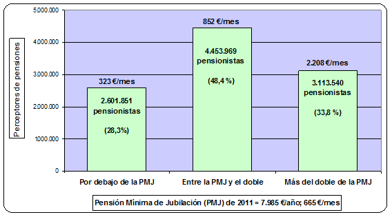Desde 2007 al menos el 28% de la población pensionista percibió menos del importe de la pensión mínima anual (7.985 ese año). Tal como se recoge en el Gráfico 3, 2,6 millones de perceptores recibieron en 2011 una pensión media de 323 euros mensuales y otros 4,4 millones subsistieron con 852 euros por mes.