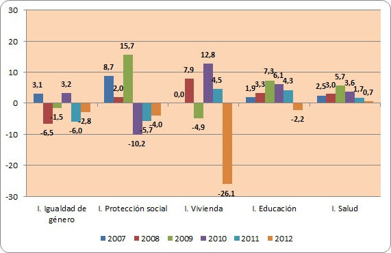 Gráfico 2. Variación anual de los índices de situación y políticas sociales (2007-2012)